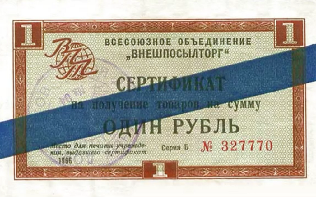 Välisvaluuta aseaine NSV Liidus oli sinise triibuga sertifikaat. Autor/allikas: Kuvatõmmis YouTube`i filmiklipist: https://www.youtube.com/watch?v=DSe3iMD_aw8