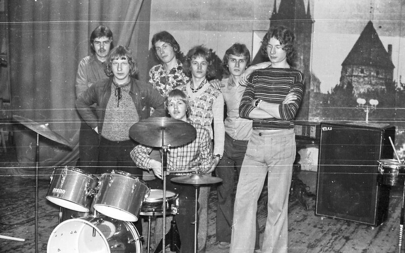 Fotol on ansambel Tahukas 1970ndail aastail. Aarne Saluveer on paremalt teine (Saluveeri erakogu).